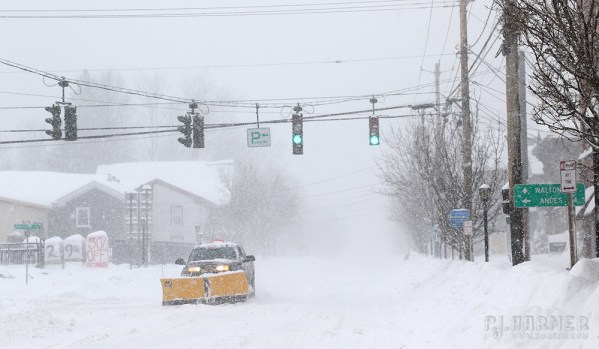 On the first day of Stella, I decided to walk and take photos. This one shows the four signal lights (counting the two “sets” as one each — two pointing the other way) in the midst of the storm. Turns out the plow was a friend, too, out doing what he could to try and keep up.