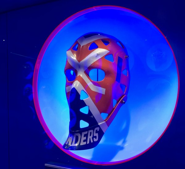 From a display at the Hockey Hall of Fame in Toronto — goalie masks are often colorful and fancy!