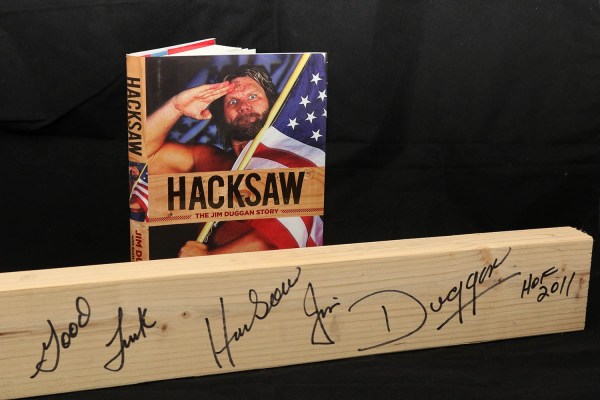 A couple of years ago, me and my brother went and saw the Hacksaw Jim Duggan show, which was a humorous “stand up” type setting where he told stories about his years in wrestling. After the event, of course, you could meet Hacksaw and buy a few things that he’d sign. I did one of the bigger packages, where I got his book, a 2×4, and a photo. Pretty cool stuff.